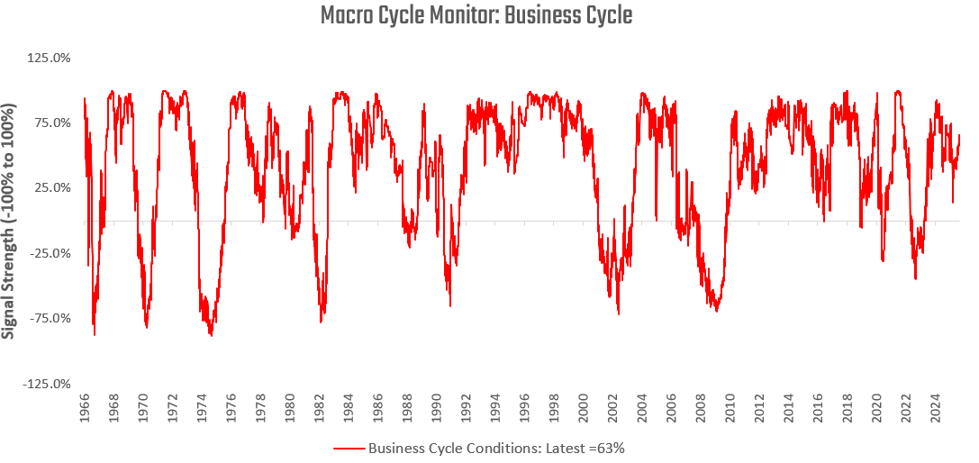 Our systems aggregate a wide variety of fundamental economic data to create timely proprietary estimates for the current stages of the macro cycle. We share some of these gauges, starting with our signals for business cycle conditions: