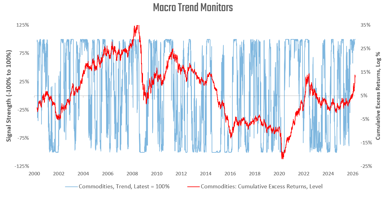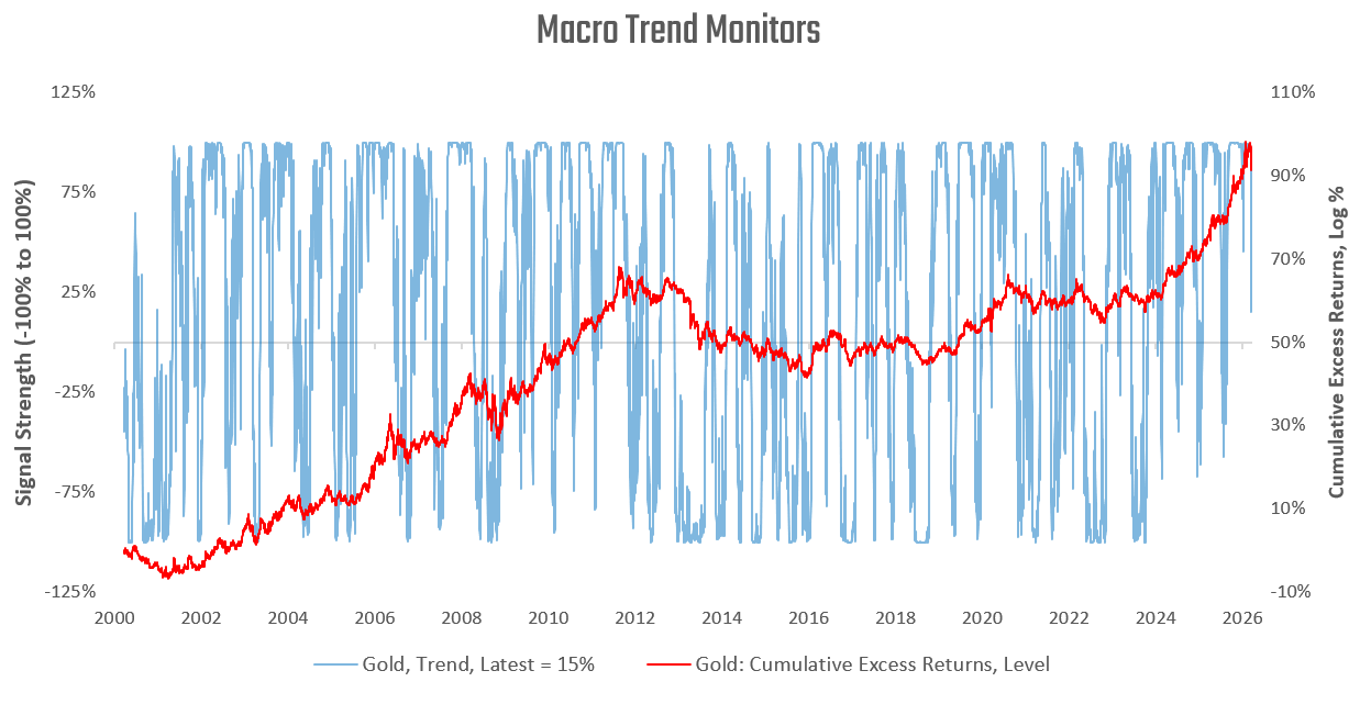 Commodity trends remain extremely strong amid geopolitical tensions. Next, we examine our macro trend signals for Gold: