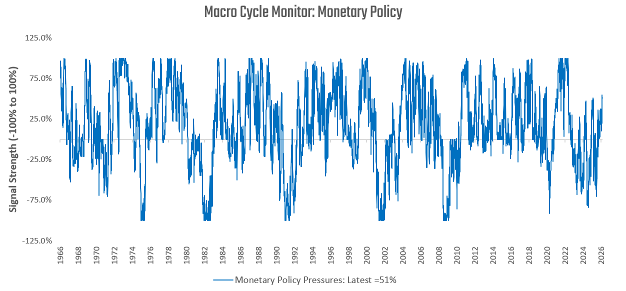 Our latest readings continue to indicate an expanding business cycle. Next, we turn to monetary policy pressures. Our monetary policy gauge measures the pressures on the Federal Reserve to move monetary policy based on the trade-off between growth and inflation data. The higher our readings, the more pressure there is to hike policy rates. The lower the gauge, the more pressure there is to cut policy rates.