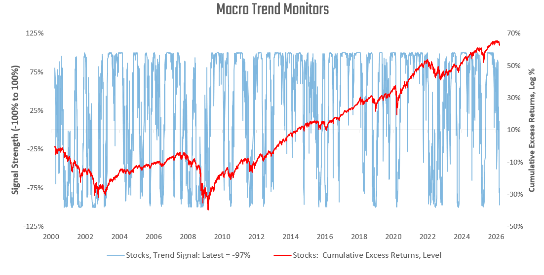 Asset prices in aggregate reflect changes in conditions relative to expectations. As such, carefully monitoring macro market trends is an integral part of evaluating conditions in the macroeconomy. To do this, we use our macro trend monitors, which we share here. We begin with stocks: