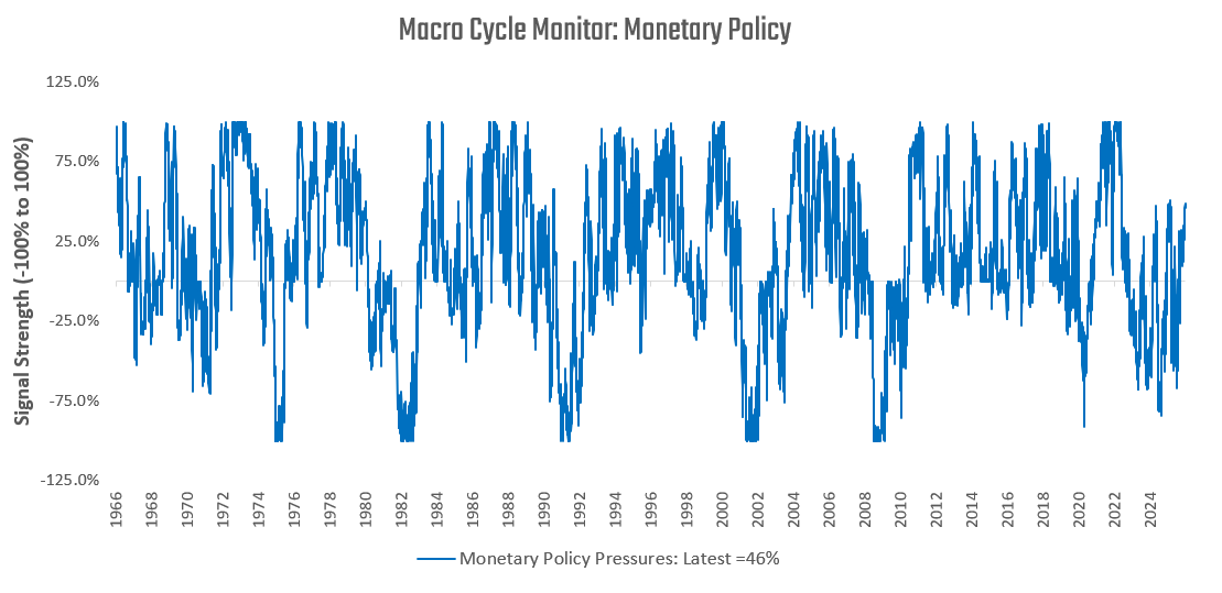 Our latest readings continue to show consistent signs of an expanding business cycle. Next, we turn to monetary policy pressures. Our monetary policy gauges measure the pressures on the Federal Reserve to move monetary policy based on the trade-off between growth and inflation data. The higher our readings, the more pressure there is to hike policy rates. The lower the gauge, the more pressure there is to cut policy rates.