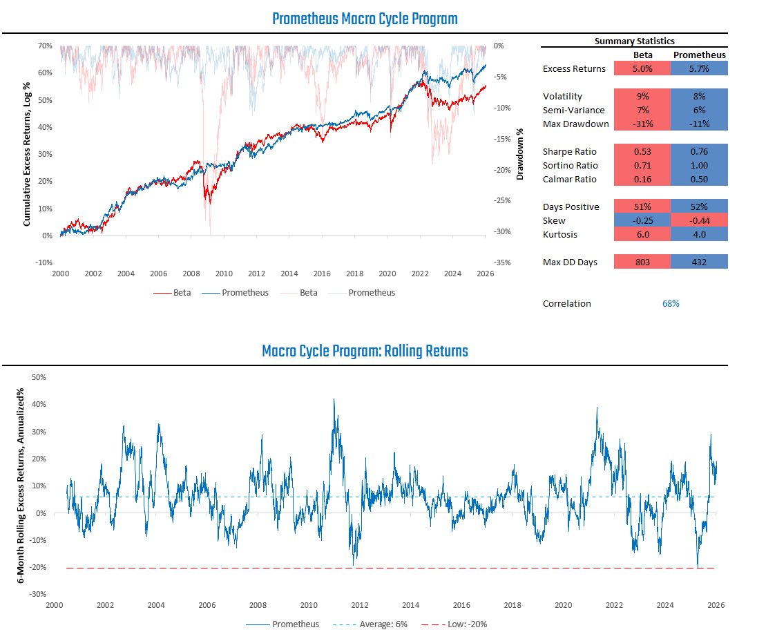 Combining these indicators, a Macro Cycle Allocation would be long stocks (33%), flat bonds (0%), and long commodities (33%). We visualize the simulated path of using this process below: