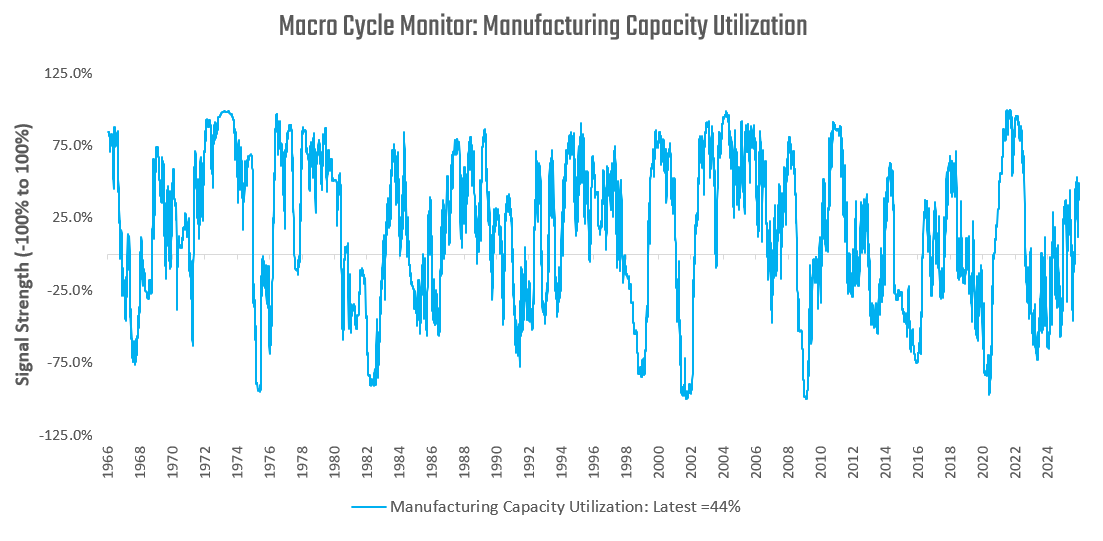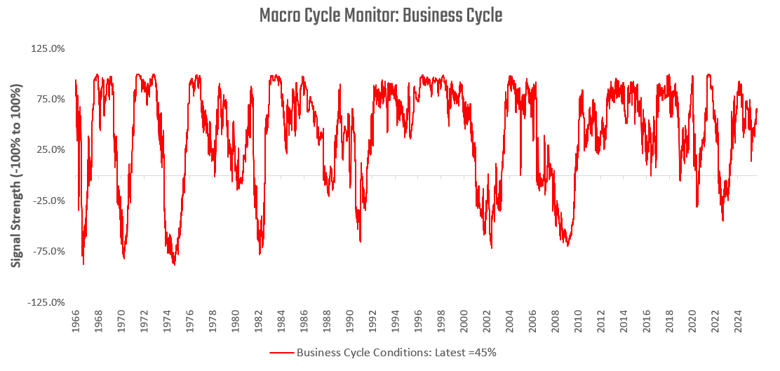 Our systems aggregate a wide range of fundamental economic data to produce timely, proprietary estimates of the current stages of the macro cycle. We share some of these gauges, starting with our signals for business cycle conditions: