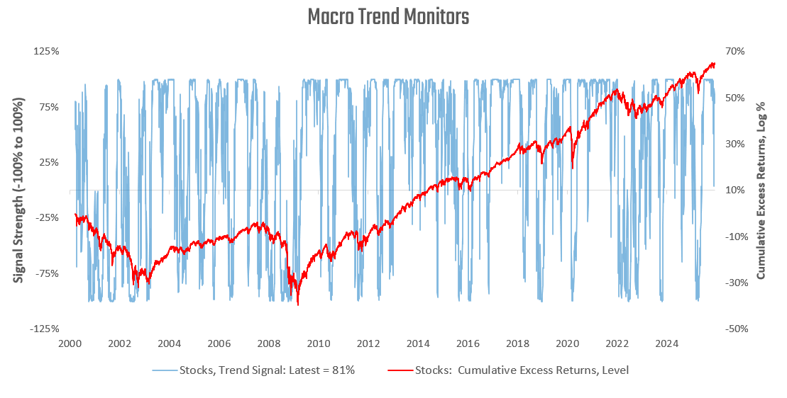 Asset prices in aggregate reflect changes in conditions relative to expectations. As such, carefully monitoring macro market trends is an integral part of evaluating conditions in the macroeconomy. To do this, we use our macro trend monitors, which we share here. We begin with stocks: