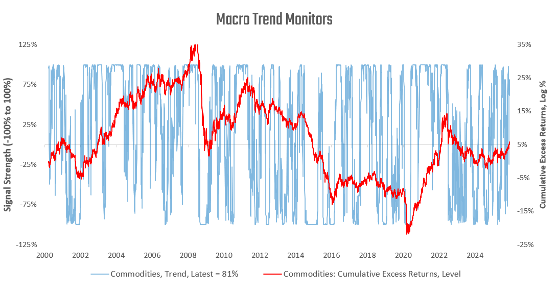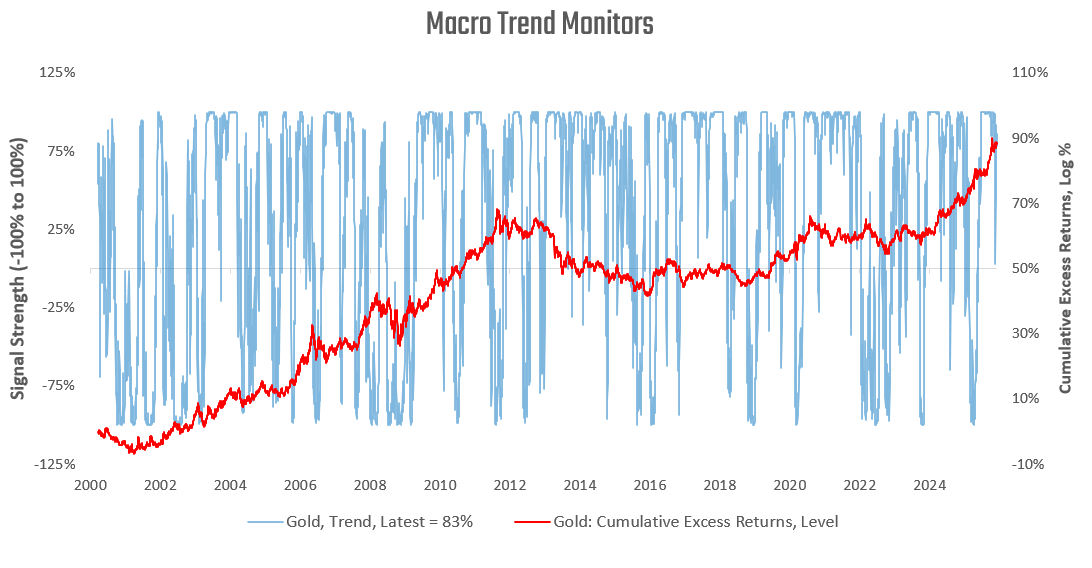 Commodity trends have moderated, but remain positive. Finally, we examine our macro trend signals for gold: