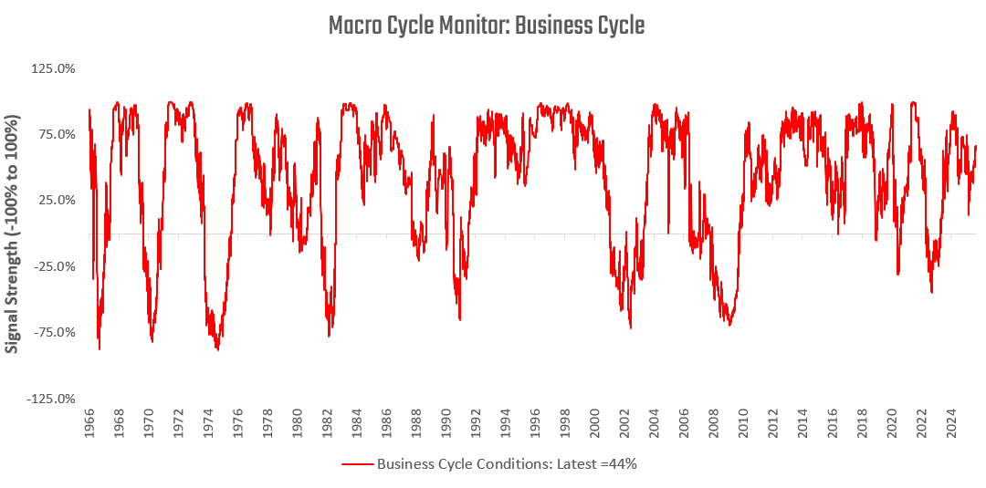 Our systems aggregate a wide variety of fundamental economic data to create timely proprietary estimates for the current stages of the macro cycle. We share some of these gauges, starting with our signals for business cycle conditions: