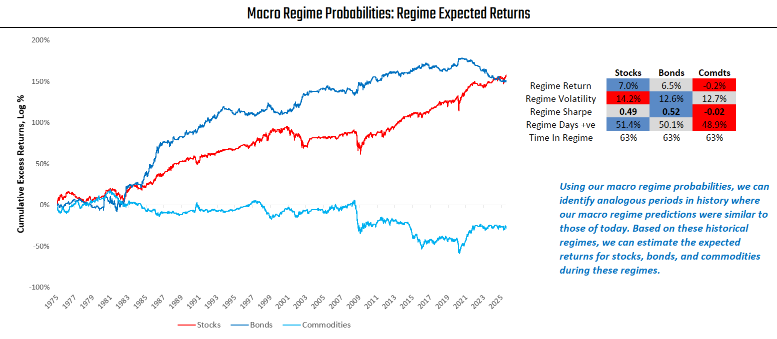 Our Macro Regime Monitors show that the distribution of regime probabilities is dominated by falling inflation. We visualize the expected return profiles that one can expect during this distribution of predicted regimes below: