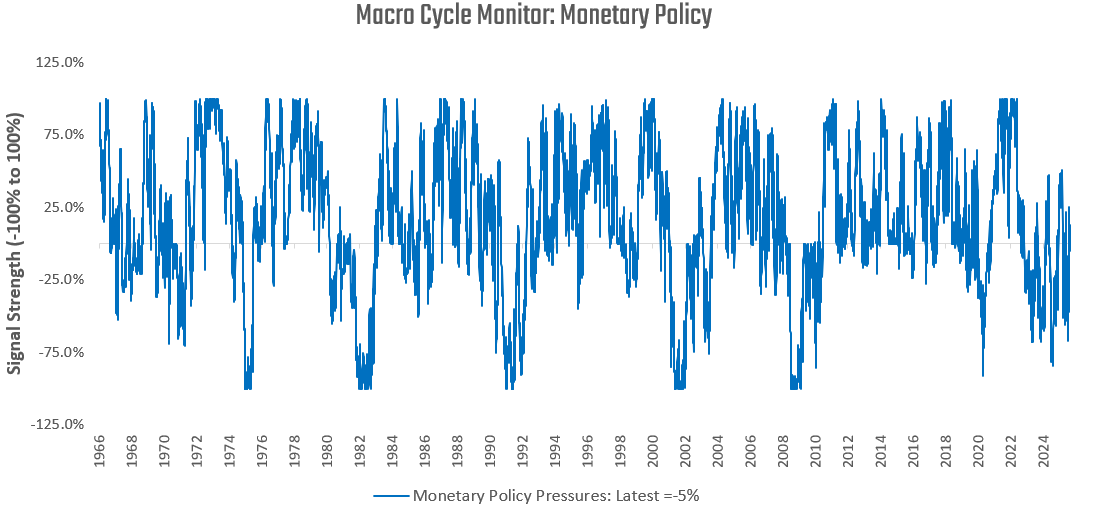 Our latest readings continue to show consistent signs of an expanding business cycle. Next, we turn to monetary policy pressures. Our monetary policy gauges measure the pressures on the Federal Reserve to move monetary policy based on the trade-off between growth and inflation data. The higher our readings, the more pressure there is to hike policy rates. The lower the gauge, the more pressure there is to cut policy rates.