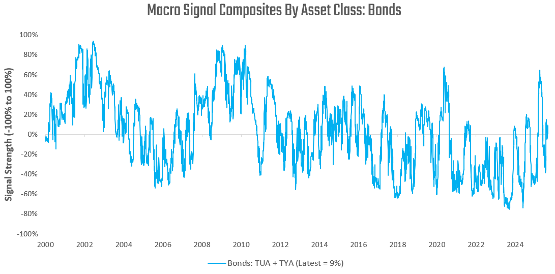 Equities continue to present a moderately positive signal strength, supporting modest exposure. Next, we turn to our bond signals for an equal-weighted blend of TUA and TYA: