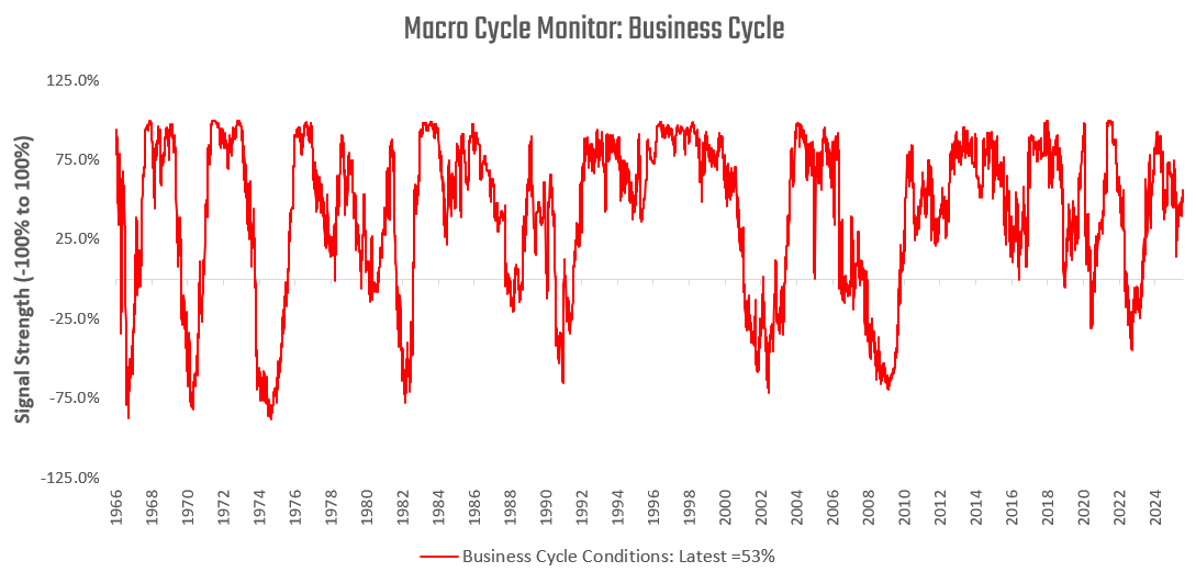 Our systems aggregate a wide variety of fundamental economic data to create timely proprietary estimates for the current stages of the macro cycle. We share some of these gauges, starting with our signals for business cycle conditions: