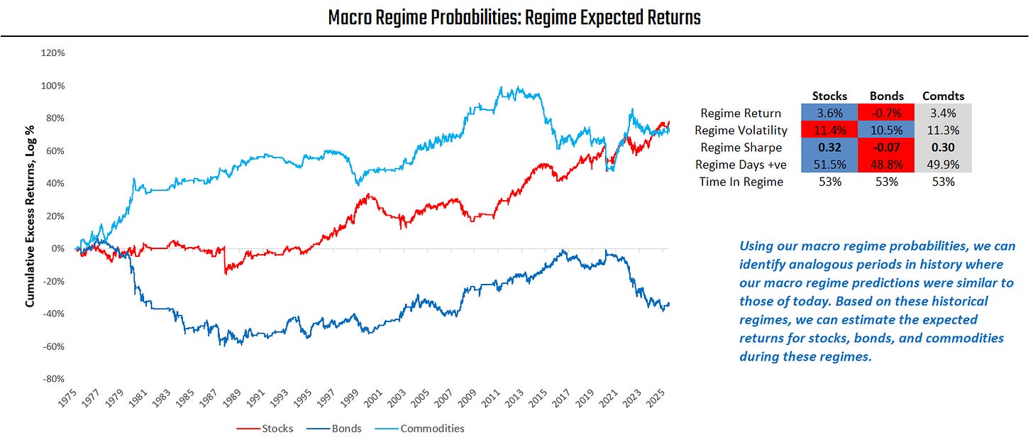 Our Macro Regime Monitors show that the distribution of regime probabilities is dominated by rising growth. We visualize the expected return profiles that one can expect during this distribution of predicted regimes below: