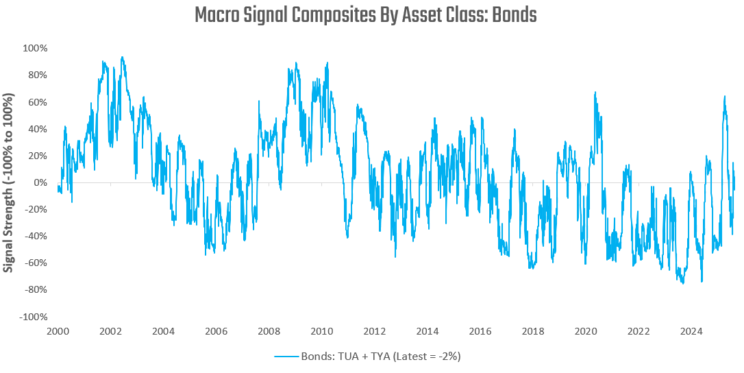 Equities continue to present a minimally positive signal strength, supporting minimal exposure. Next, we turn to our bond signals for an equal-weighted blend of TUA and TYA:
