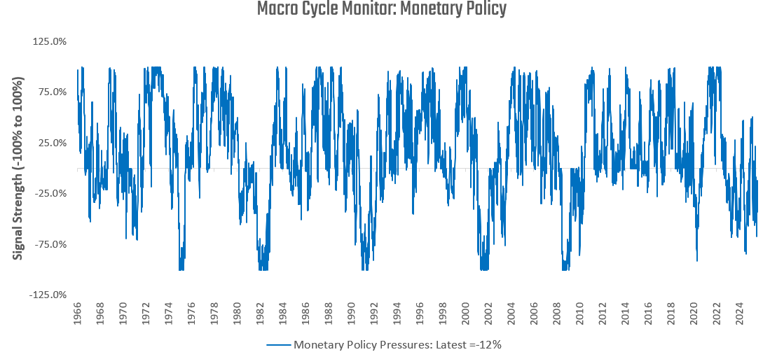 Our latest readings continue to show consistent signs of an expanding business cycle. Next, we turn to monetary policy pressures. Our monetary policy gauges measure the pressures on the Federal Reserve to move monetary policy based on the trade-off between growth and inflation data. The higher our readings, the more pressure there is to hike policy rates. The lower the gauge, the more pressure there is to cut policy rates.