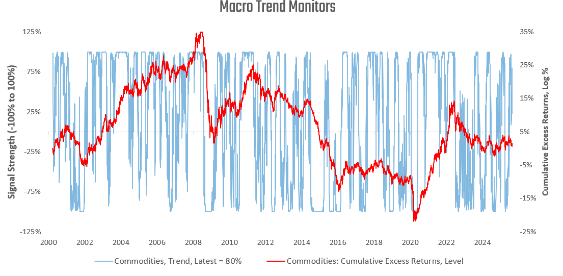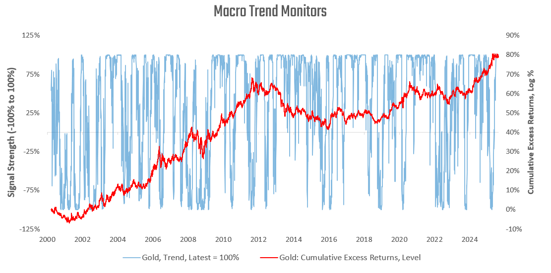 Commodity markets are now in a moderating uptrend. Finally, we examine our macro trend signals for gold: