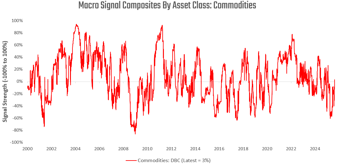 Using the macro cycle gauges, adding asset-specific factors, and leveraging carry, trend, and reversion, we can create asset-class-specific composite signals. We share these signals below and their latest readings. These signals are proportional to our conviction for a given asset and are directly tradeable. We begin with our stock signals for SPY: