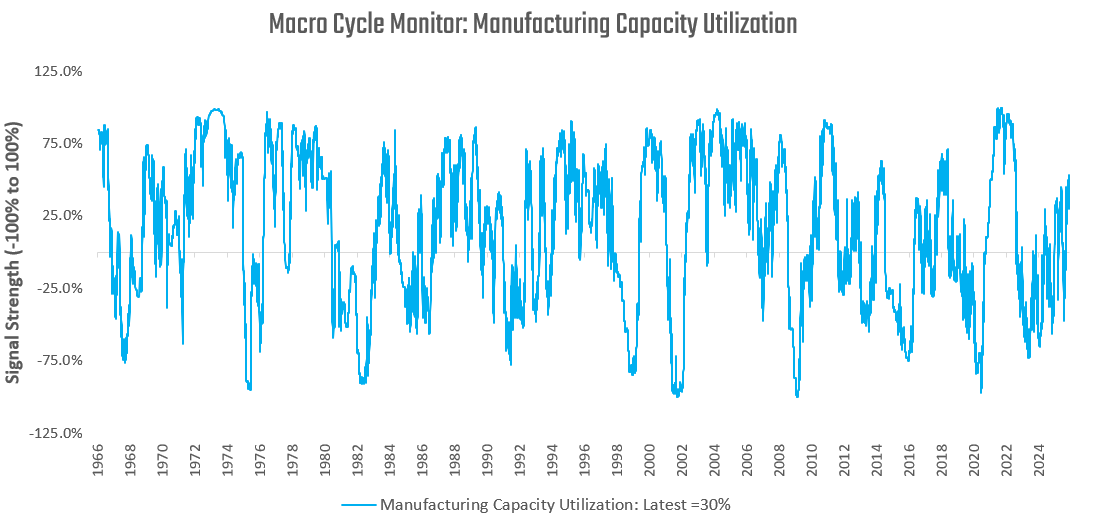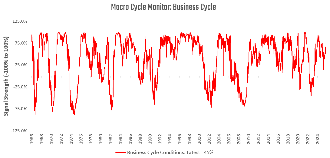 Our systems aggregate a wide variety of fundamental economic data to create timely proprietary estimates for the current stages of the macro cycle. We share some of these gauges, starting with our signals for business cycle conditions:
