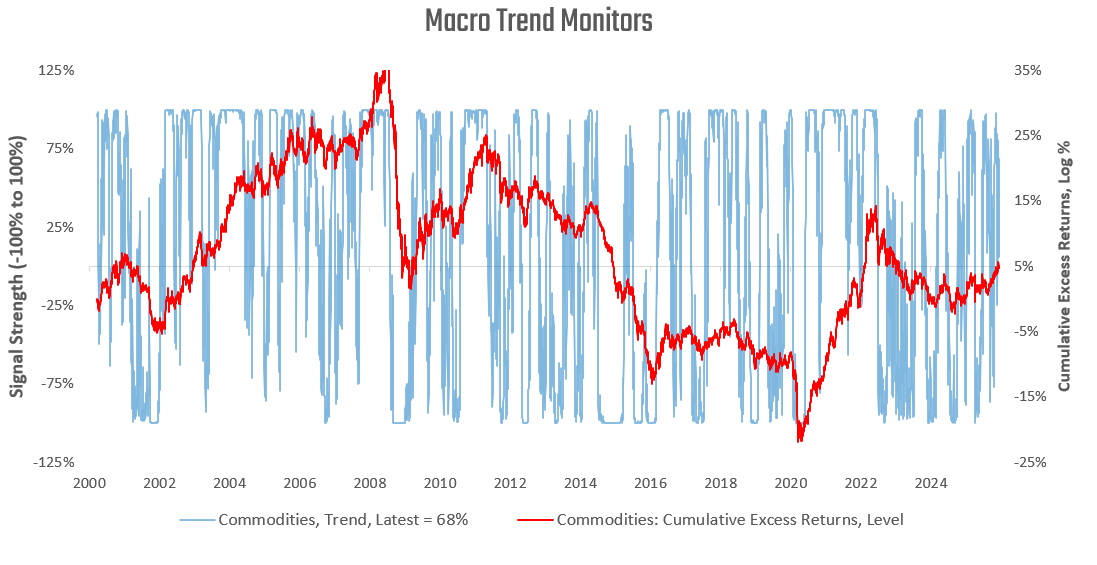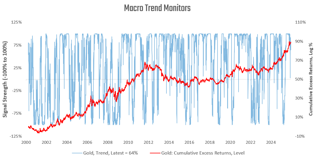 Commodity trends have moderated, but remain positive. Finally, we examine our macro trend signals for gold: