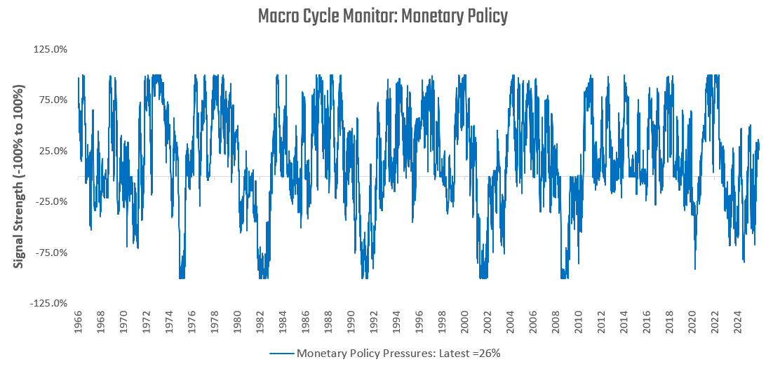 Our latest readings continue to show consistent signs of an expanding business cycle. Next, we turn to monetary policy pressures. Our monetary policy gauges measure the pressures on the Federal Reserve to move monetary policy based on the trade-off between growth and inflation data. The higher our readings, the more pressure there is to hike policy rates. The lower the gauge, the more pressure there is to cut policy rates.