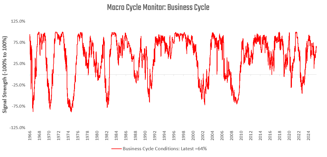 Our systems aggregate a wide variety of fundamental economic data to create timely proprietary estimates for the current stages of the macro cycle. We share some of these gauges, starting with our signals for business cycle conditions: