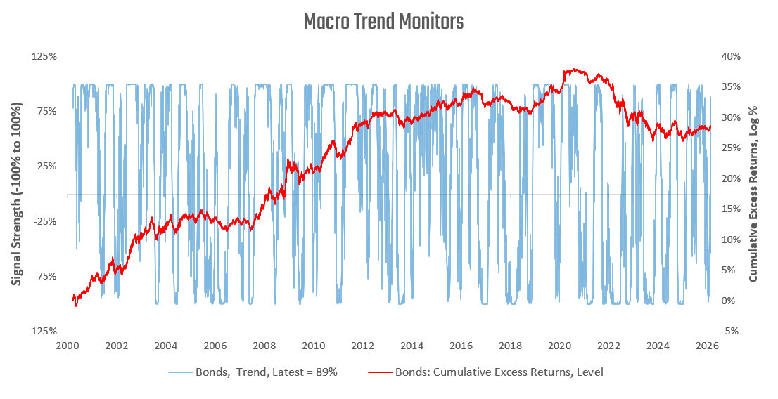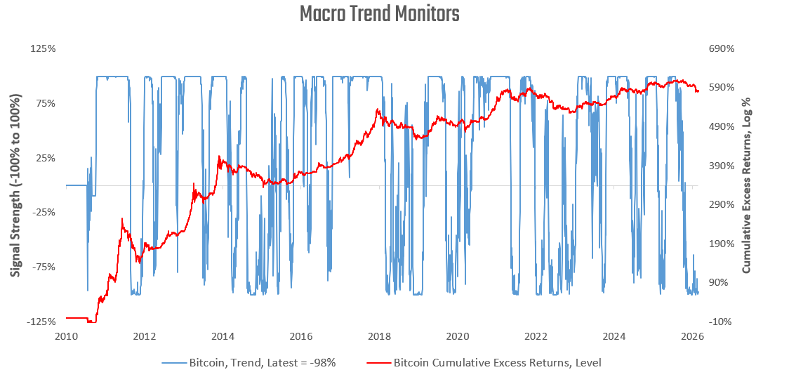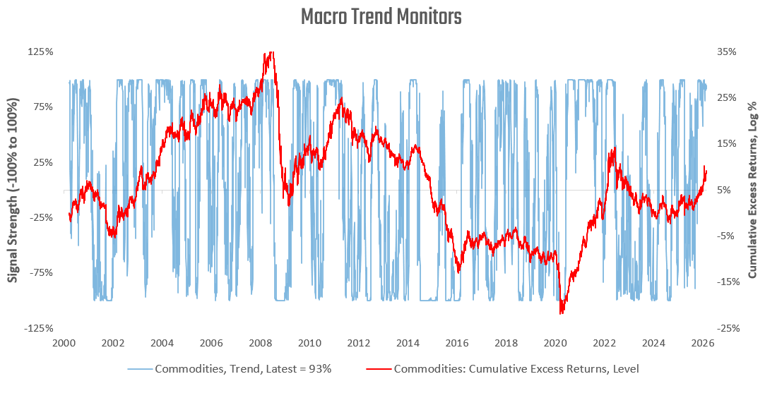 Macro assets are experiencing cross-asset trends that are beginning to shift, with equity trends now in negative territory, commodity trends remaining strong, and bond trends remaining weak.
