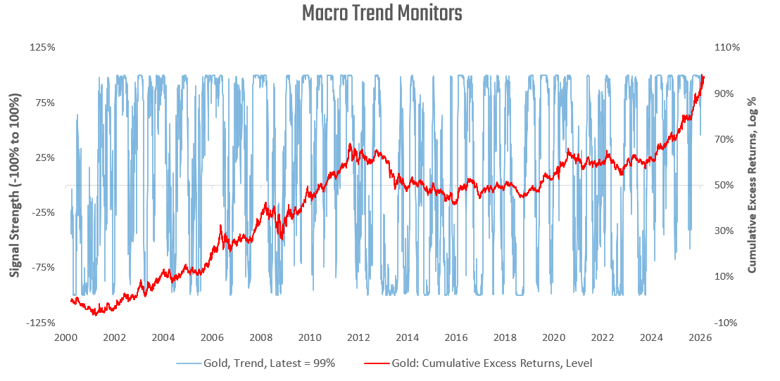 Commodity trends remain strong. Next, we examine our macro trend signals for Gold: