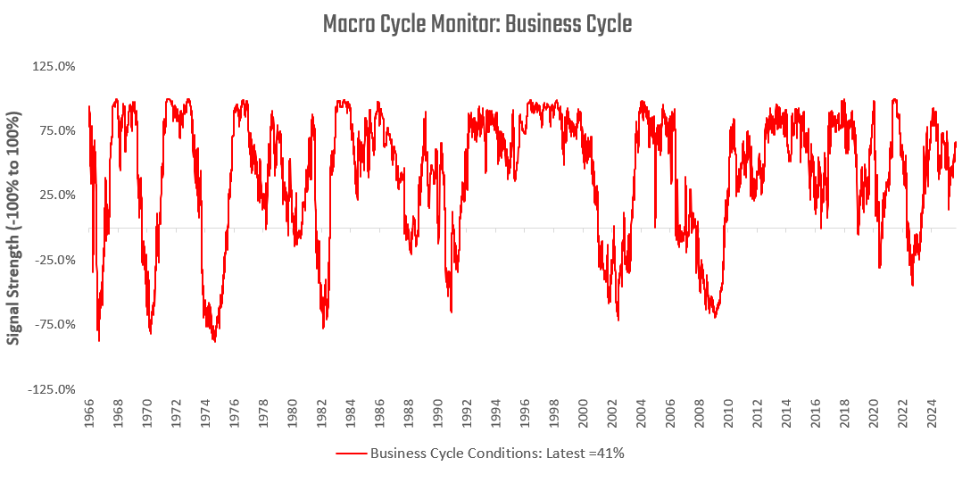 Our systems aggregate a wide variety of fundamental economic data to create timely proprietary estimates for the current stages of the macro cycle. We share some of these gauges, starting with our signals for business cycle conditions: