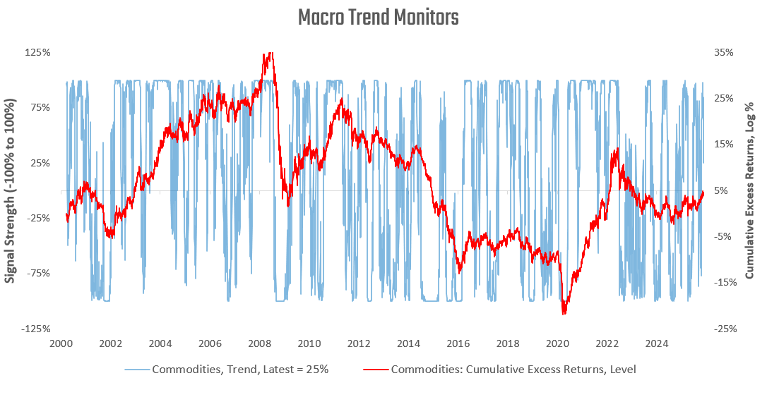Commodity trends have moderated, but remain positive. Finally, we examine our macro trend signals for gold: