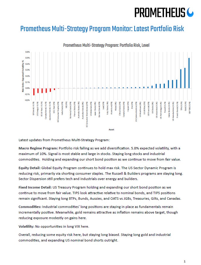The Prometheus Multi-Strategy Program is our primary offering to institutional investors. The Monitor is how we track and communicate the positioning and reasoning of the Prometheus Multi-Strategy Program. The program systematically trades 40 global markets on a daily basis.