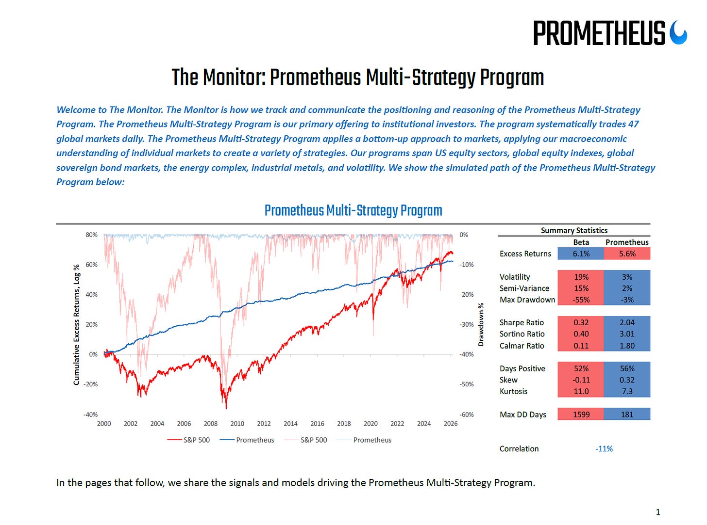 The Prometheus Multi-Strategy Program is our primary offering to institutional investors. The Monitor is how we track and communicate the positioning and reasoning of the Prometheus Multi-Strategy Program. The program systematically trades in 47 global markets daily.