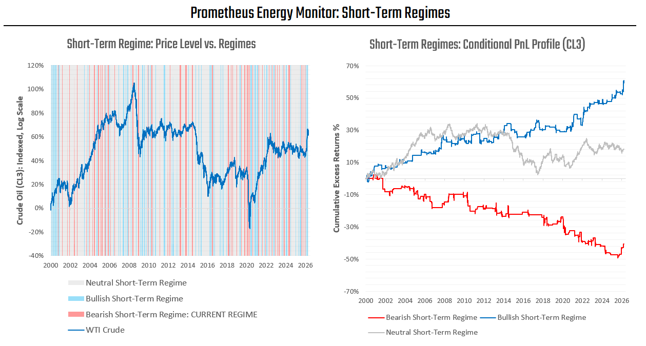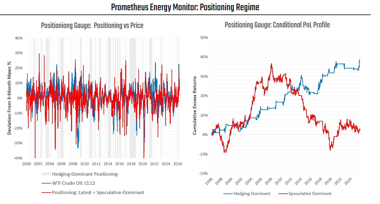 While Prometheus Multi-Strategy is not currently deploying material directional risk exposure, we see two avenues for future signal strength. First, we see a positive backdrop for the oil complex, particularly for back-dated contracts. While our short-term signals for the energy complex have turned neutral since April 8, we are starting to see some shifts in the dynamics underlying price action— becoming more conducive to oil beta. Principally, energy markets are composed of two participants: speculators and hedgers. Speculators seek financial gain through their exposure to commodity futures. Hedgers, on the other hand, seek insurance against future revenue volatility. While hedgers seek to minimize hedging costs, they are not profit-seeking in futures markets. This relative near-term price-insensitivity makes their flow mechanical and more consistent in markets. As such, hedgers are a countercyclical force in markets— pushing down prices relative to their fair value as commodities rise due to shortages. This creates a conducive backdrop for owning energy futures beta. Below, we show how our positioning regime monitor allows us to classify periods into those where speculators are dominant versus those where hedgers are dominant: