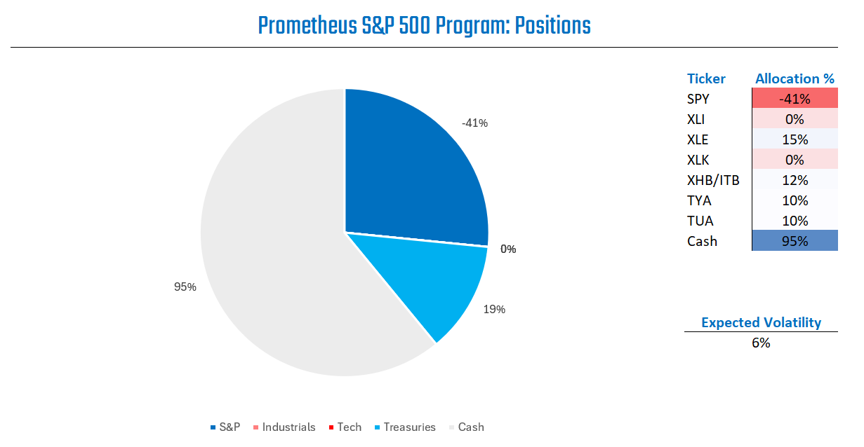 The Prometheus S&P 500 Program aims to outperform the S&P 500 over a full investment cycle. The program will strive to achieve this objective by leveraging a combination of Sector Selection, Beta Timing, Active Overlays, and Dynamic Risk Control. Our S&P 500 Program can be integrated with our Crisis Protection Program, which seeks to offer a portfolio diversifier during periods of economic and financial instability by blending active, long-only exposure to Gold, TIPS, and VIX.