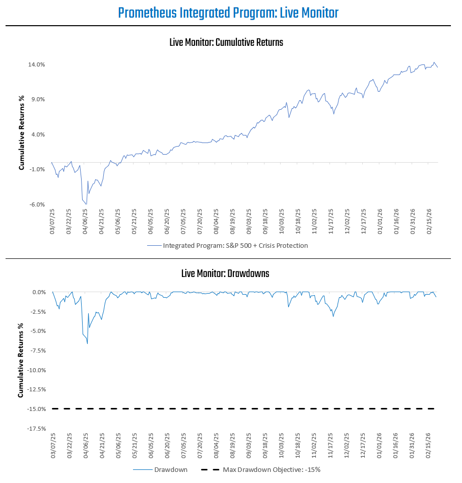 The Prometheus S&P 500 Program aims to outperform the S&P 500 over a full investment cycle. The program will strive to achieve this objective by leveraging a combination of Sector Selection, Beta Timing, Active Overlays, and Dynamic Risk Control. Our S&P 500 Program can be integrated with our Crisis Protection Program, which seeks to offer a portfolio diversifier during periods of economic and financial instability by blending active, long-only exposure to Gold, TIPS, and VIX.