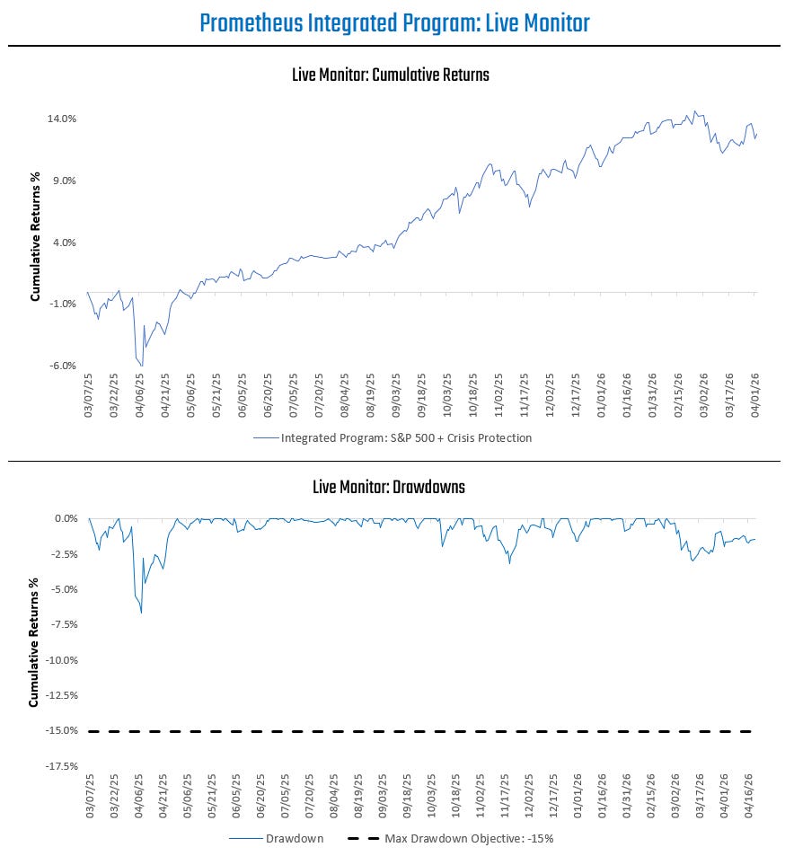 The Prometheus S&P 500 Program aims to outperform the S&P 500 over a full investment cycle. The program will strive to achieve this objective by leveraging a combination of Sector Selection, Beta Timing, Active Overlays, and Dynamic Risk Control. Our S&P 500 Program can be integrated with our Crisis Protection Program, which seeks to offer a portfolio diversifier during periods of economic and financial instability by blending active, long-only exposure to Gold, TIPS, and VIX.