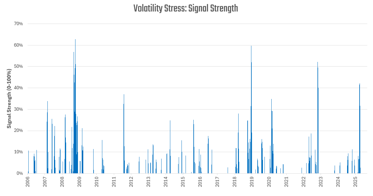 The most crucial part of this program is its correlation to equity markets. During equity market down days, this program has a mean Sharpe Ratio of 2, suggesting strong diversification characteristics to beta. Today, these programs do not see signs of elevated financial stress, which we capture in the form of our Volatility Stress gauge: