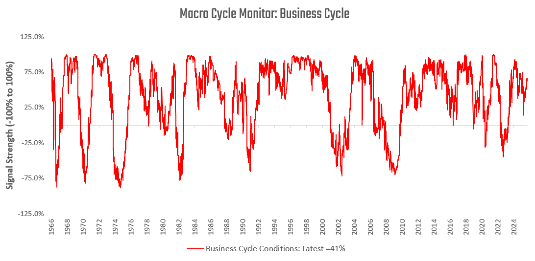 Our latest tracking of economic growth indicates that the business cycle is slowing modestly, but remains in an expansionary phase. We show these proprietary tradable signals below: