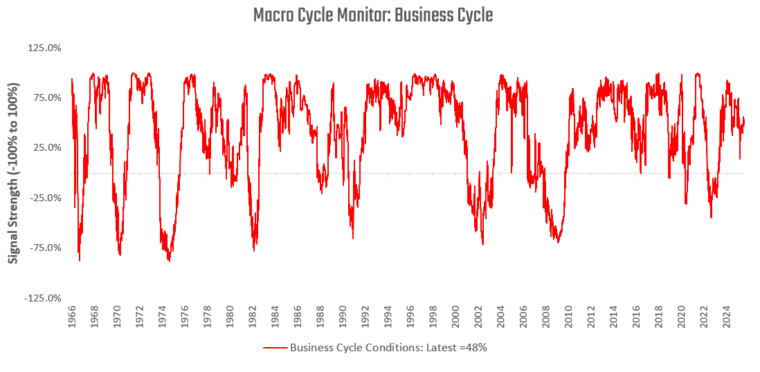 Our latest tracking of economic growth indicates that the business cycle is slowing modestly, but remains in an expansionary phase. We show these proprietary tradable signals below: