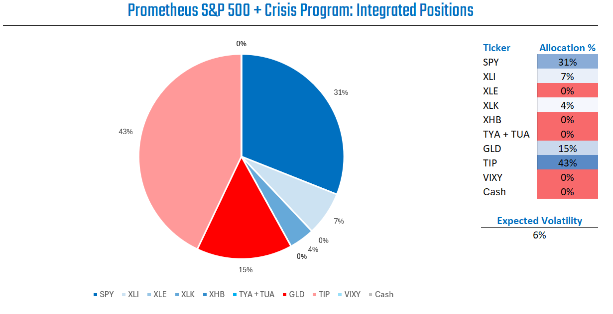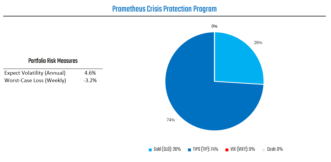 Nonetheless, gold and TIPS offer attractive expected returns during periods of elevated nominal GDP, easy monetary conditions, and above target inflation. As such, the Prometheus Crisis Protection Program is allocated as follows: