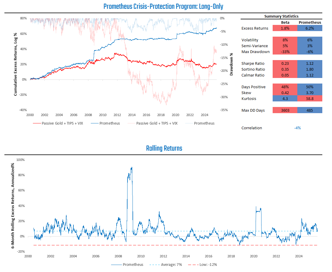 The Prometheus Crisis Protection program seeks to offer a portfolio diversifier during periods of economic and financial instability by blending active exposure to Gold, TIPS, and VIX. Actively managing these exposures is integral, as their expected returns are time varying with the macro cycle. We demonstrate how actively managing these exposures can add significant value compared to holding them passively:
