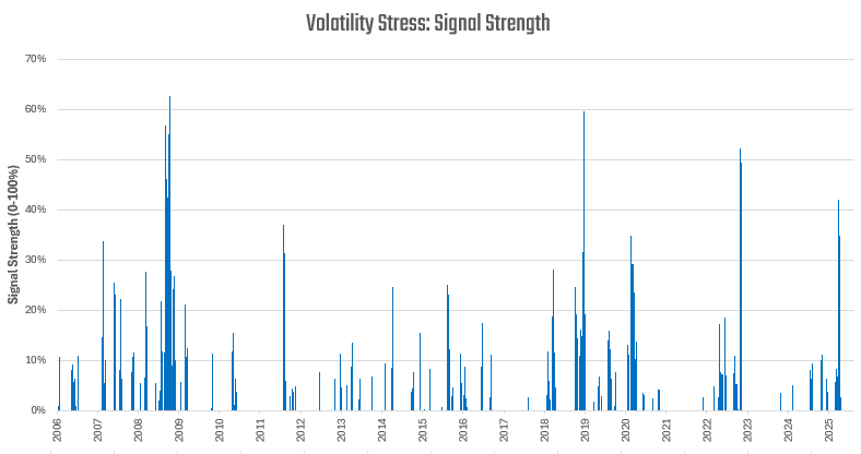 The most crucial part of this program is its correlation to equity markets. During equity market down days, this program has a mean Sharpe Ratio of 2, suggesting strong diversification characteristics to beta. Today, these programs do not see signs of elevated financial stress, which we capture in the form of our Volatility Stress guage: