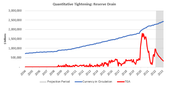 While Treasury securities are assets to the financial economy, Treasury cash is a drain on the financial sector. The Treasury creates liquidity for the financial system by creating and backstopping government securities. Conversely, the Treasury repurposes private sector finances through debt financing and spending. Traditionally, the Treasury impacts Reserve Balances through changes in its cash balances *TGA) held with the Fed. Increases in Treasury cash decrease the reserves available to the private sector (even though this cash is usually just repurposed and re-injected). Using the Treasury’s own estimates, we can estimate TGA balances in September. We then assume reversion to 2018-2019 mean cash levels by 2023. We can show the drain the Treasury will have on Reserves below. Additionally, we also model for currency in circulation (using seasonality), which is another drain on reserves.