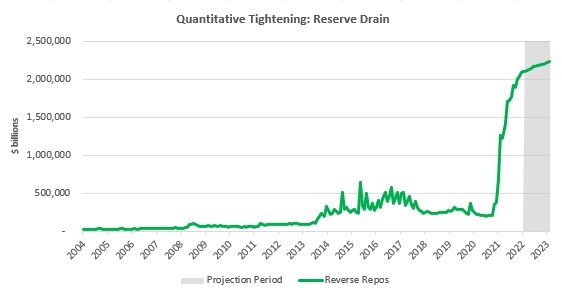 Money Market Funds opportunity set. Money Market Funds (MMFs) are a liquidity source that could ameliorate the impacts of QT significantly. However, MMFs remain constrained by the existing opportunity set. Therefore, even if MMFs wanted to leave the Feds Reverse Repo Facility, they likely wouldn’t have many places to go without significant Treasury issuance.