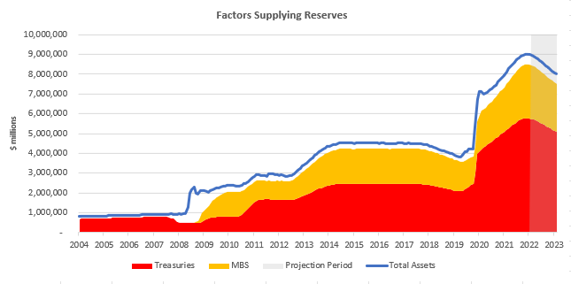 To start the QT process, the Fed has outlined its “caps” to reduce Treasuries and MBS. These caps are the maximum pace at which the Fed will let these assets shrink on its balance sheet, and currently, the Fed has caps of $30 billion/month of Treasuries and $17.5 billion/month in MBS. If this goes smoothly, they will increase the pace to $60 billion/month of Treasuries and $35 billion/month in MBS. Using these guidelines, we can estimate the future total factors supplying reserves to the financial sector, i.e., project the Fed’s balance sheet: