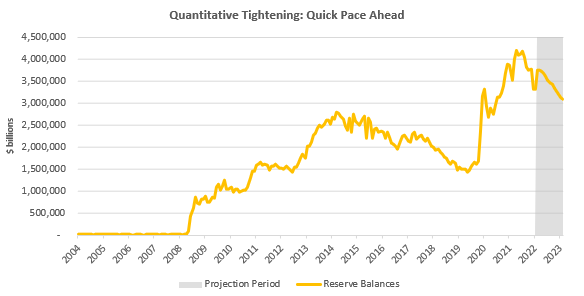 However, the Fed estimates that MBS securities will not meet the existing caps. This is because the run-down of MBS securities will not come from maturities but from pre-payment of MBS. With interest rates rising, we think it unlikely that mortgage prepayment is likely to increase significantly. Therefore, we think that the conversation about outright sales of MBS could be sooner than most market participants expect. If we use a conservative estimate of approximately $20 billion/month in MBS pre-payment (consistent with current MBS reinvestment), the Fed will need to begin selling in September. The first-order consequence of this would be further pressure on mortgage rates. The second-order impact would be a further tightening of liquidity conditions. The question is whether future economic conditions will allow such tightening; we’d wager that decelerating macro conditions don’t favor this outcome. Time will tell.