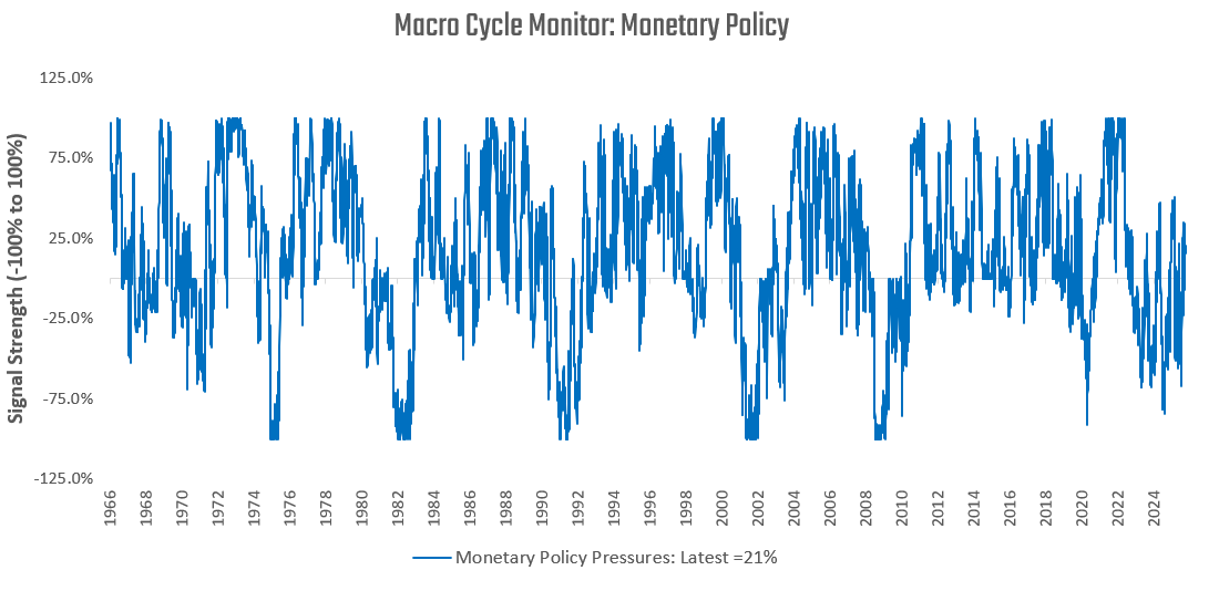 Our monetary policy gauges measure the pressures on the Federal Reserve to move monetary policy based on the trade-off between growth and inflation data. The higher our readings, the more pressure there is to hike policy rates. The lower the gauge, the more pressure there is to cut policy rates.