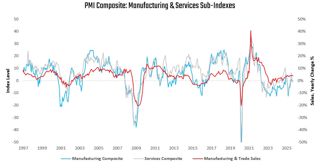 This daily gauge of nominal incomes largely aligns with GDP conditions, suggesting nominal GDP growth remains strong. Now, within that strong aggregate picture, there do remain indications of weakness. The latest PMI readings continue to show manufacturing and trade sectors continuing to battle their way out of contraction: