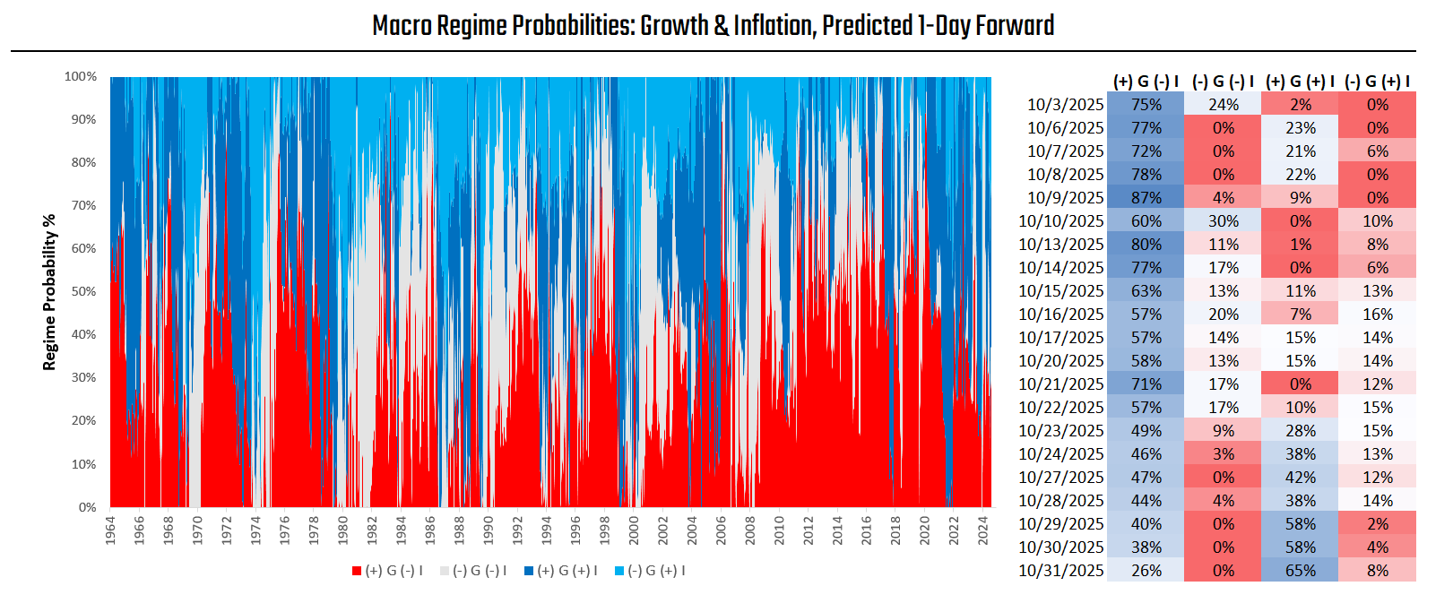 Rising nominal growth outcomes continue to dominate macro regime probabilities. A pro-cyclical bias towards asset allocation remains warranted.