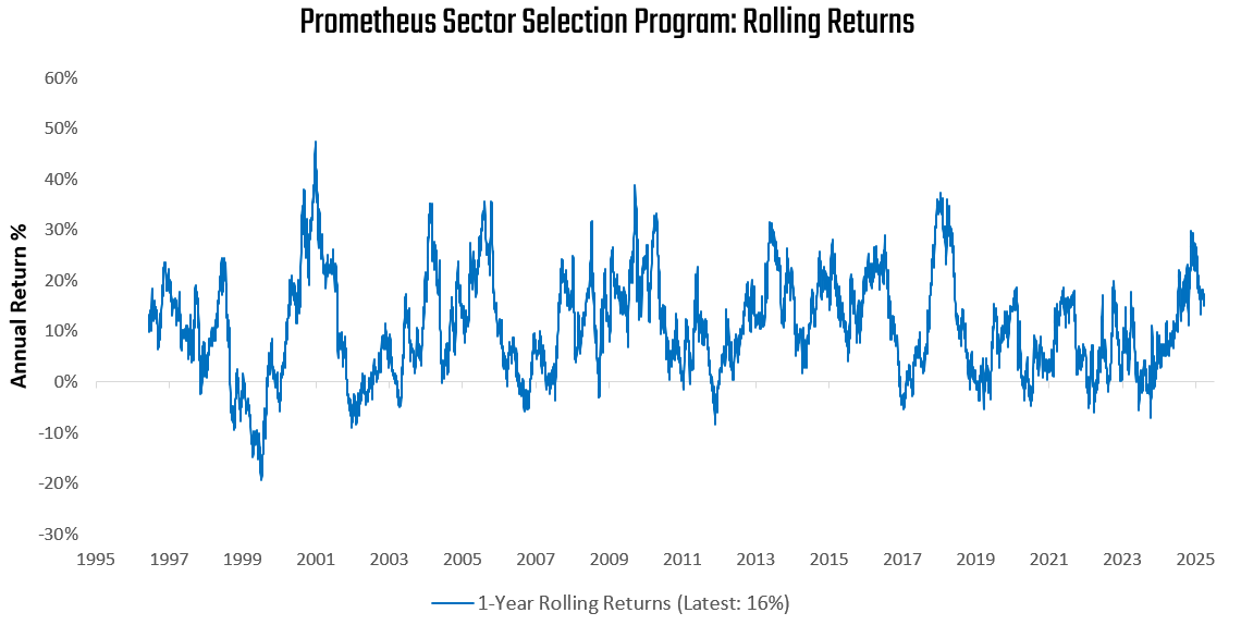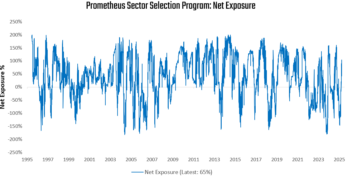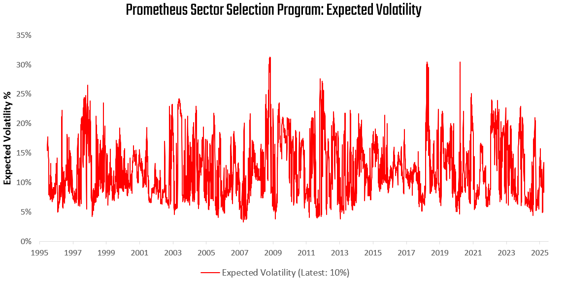 As we can see above, relative to history, our Prometheus Sector Selection program continues to maintain a modest annual volatility of 10%. Relatively low net exposure is currently containing expected volatility.