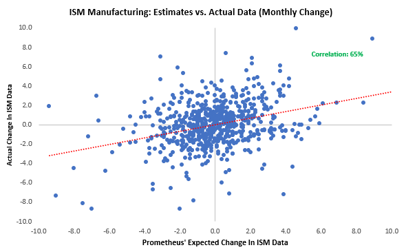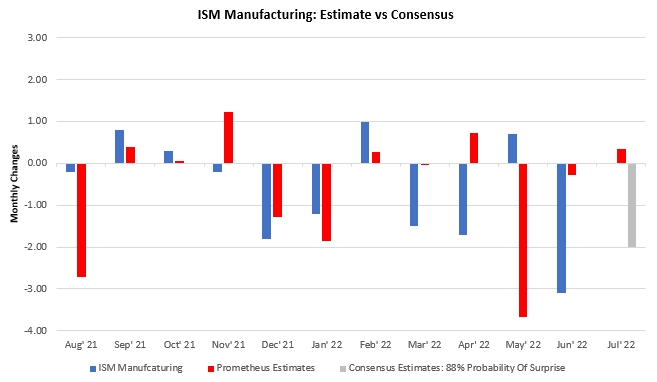 ii. ISM manufacturing data will likely surprise consensus expectations to the upside. Consensus expectations for ISM manufacturing data are for them to decline, and our systems tell us that economic forces continue to pressure PMIs lower. Nonetheless, our signals also tell us there is potential for a counter-trend surprise in the latest ISM print. Below, we show Prometheus’ estimates relative to realized data and consensus: