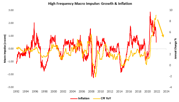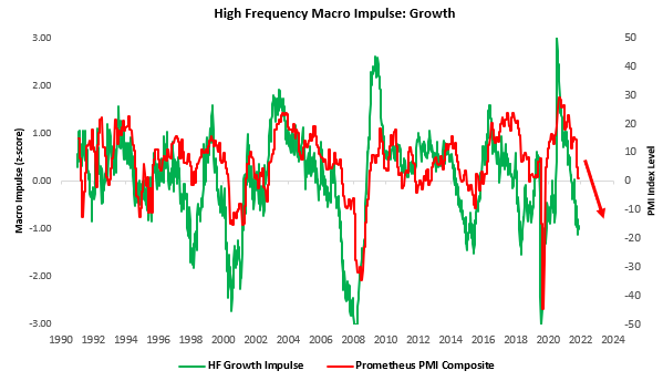 These forecasts offer insight into the print-by-print action; however, our systems take action based on longer trends that are more informative of the economic cycle. Our proprietary high-frequency impulse measures continue to tell us that the US PMIs will deteriorate. We show this gauge versus our PMI Composite below: