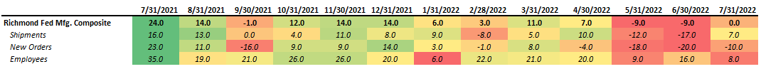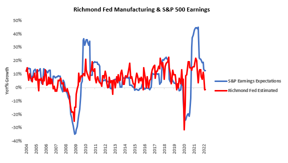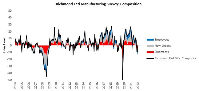 i. The latest PMI data showed some amelioration in downwards pressures. Nonetheless, the trend remains lower. We offer the latest PMI data from the Richmond Fed. The latest Richmond Fed manufacturing survey data showed a contractionary reading of 0, implying 5% YoY earnings for the S&P 500. We offer the composition of this data below: